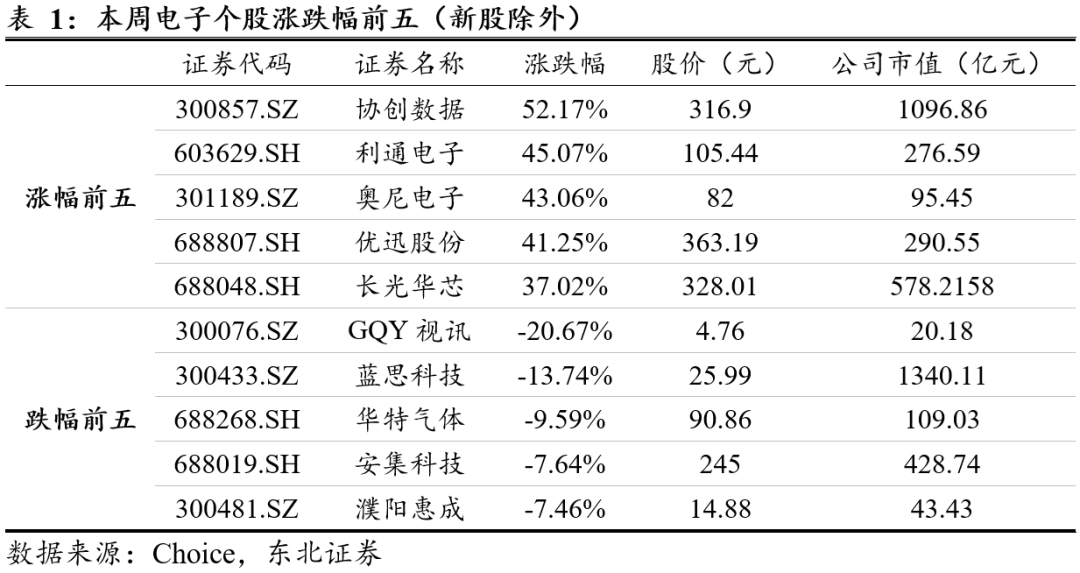 个股涨幅前三为协创数据(52.17%)、利通电子(45.07%)、奥尼电子(43.06%)。个股跌幅前三为GQY视讯(-20.67%)、蓝思科技(-13.74%)、华特气体(-9.59%)。