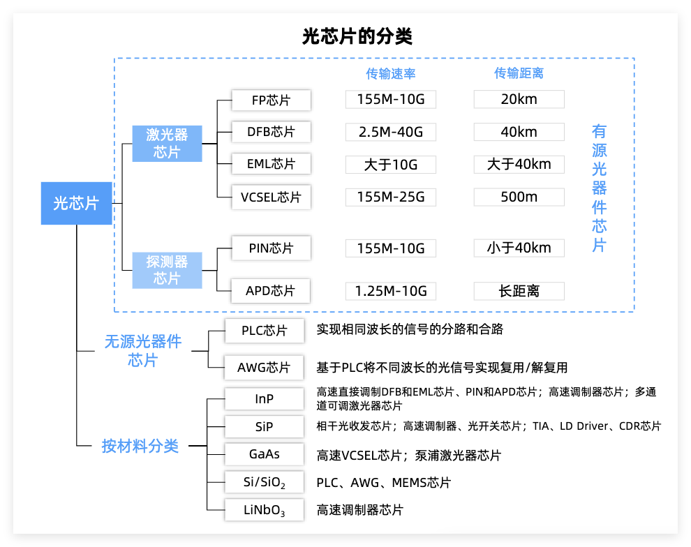 光芯片的核心功能是实现光电信号的高效转换与传输,根据是否发生光电转换分为有源和无源两类。