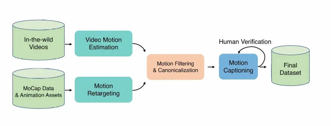 数据清洗与标准化:所有异构数据被统一重定向至一套标准骨骼。通过自动化工具剔除重叠、异常姿态、异常位移及严重滑步片段,最终统一为30fps对齐的切片数据,确保模型学习效率。