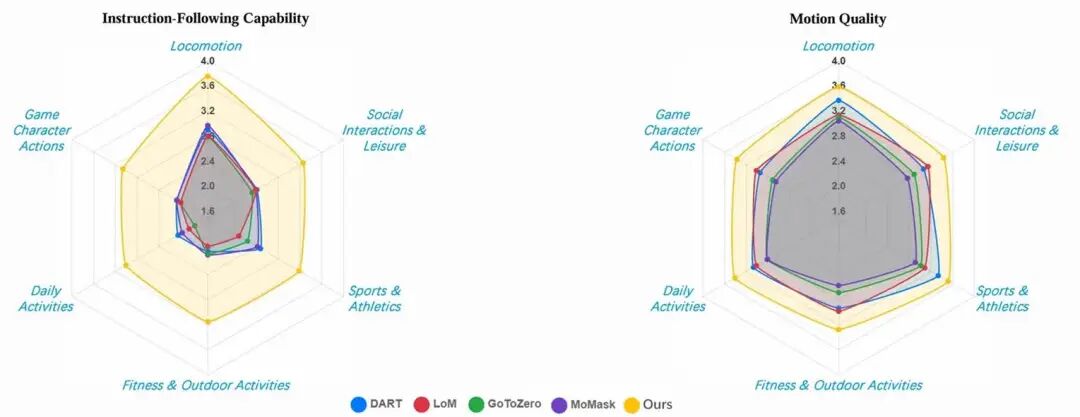 得益于参数规模及数据质量带来的提升,HY-Motion 1.0在SSAE(语义结构自动评测)指标上达到了78.6%,指令遵循能力远超SOTA模型。该结果在人工5档打分中得到了印证(如下图)。
