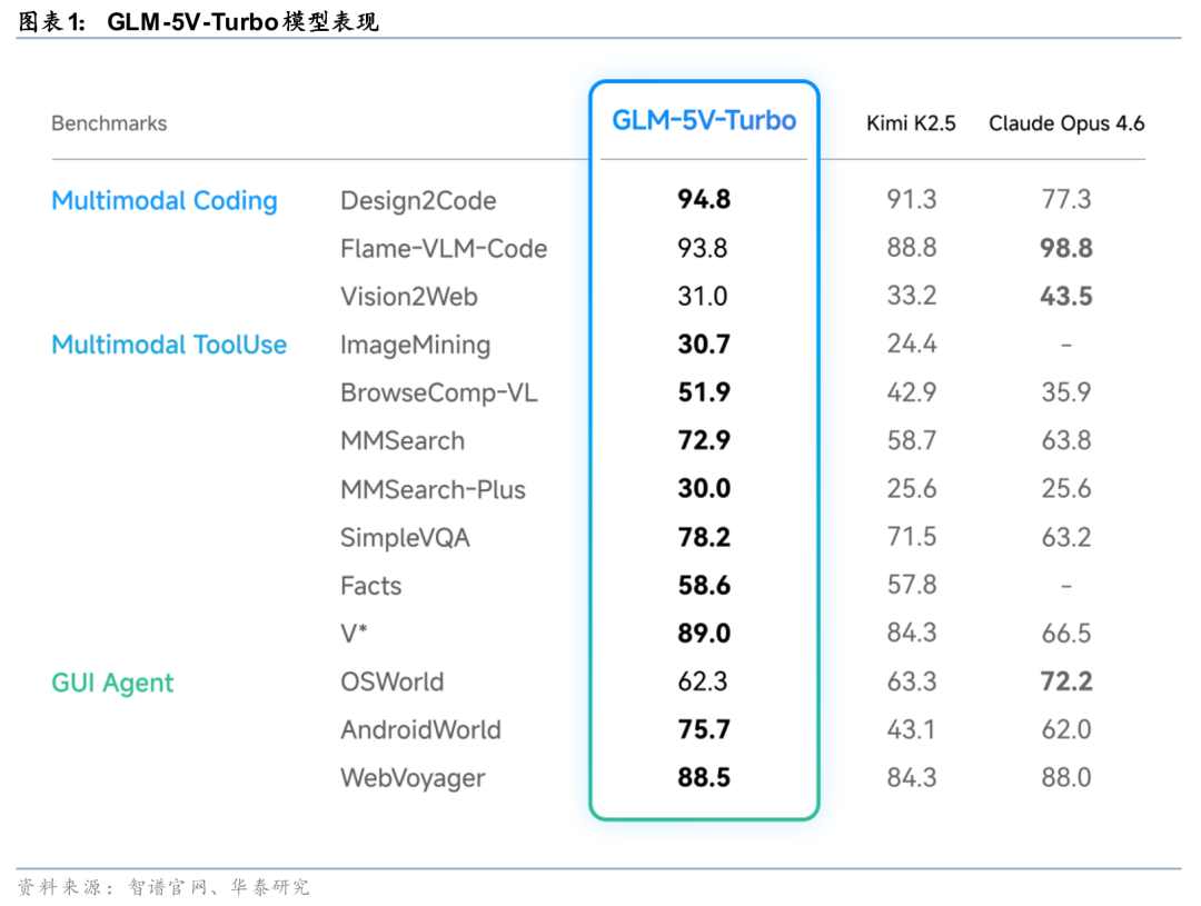 智谱本轮迭代以Agent场景为核心,推动基座能力、多模态能力及执行能力同步提升。据Z.ai官网3月15日发布说明,GLM-5-Turbo面向高吞吐OpenClaw类任务,强化Tool Calling、复杂指令拆解、定时与持续性任务及长链路执行能力;据4月1日发布说明,GLM-5V-Turbo补足视觉能力,可理解界面、设计稿、图表与文档,并强化多模态工具调用与GUI任务执行;根据4月7日发布说明,GLM-5.1面向Long-Horizon Task,支持单次运行最长8小时,形成从规划、执行到迭代优化的完整任务链路。模型能力呈现出由单点提升向多能力协同演进的特征。