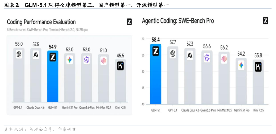 长程任务与多模态能力拓展应用边界。长时程任务能力与多模态能力的同步提升,推动模型应用边界持续拓展。据智谱AI官方X账号与官方博客4月8日披露,GLM-5.1在SWE-Bench Pro、Terminal-Bench及NL2Repo等评测中位列开源模型前列,并支持单次任务持续运行超过8小时;据智谱AI官方微信公众号4月1日披露,GLM-5V-Turbo在预训练阶段实现视觉与文本深度融合,并通过CogViT视觉编码器提升物体识别、空间理解与细粒度分析能力,在PinchBench、ClawEval及ZClawBench等评测中取得较好表现。在应用层面,模型已在AutoClaw中支持“股票分析师”等Skill,可解析K线图、估值图及研报图表,实现多源数据并行处理并输出图文结合结果。