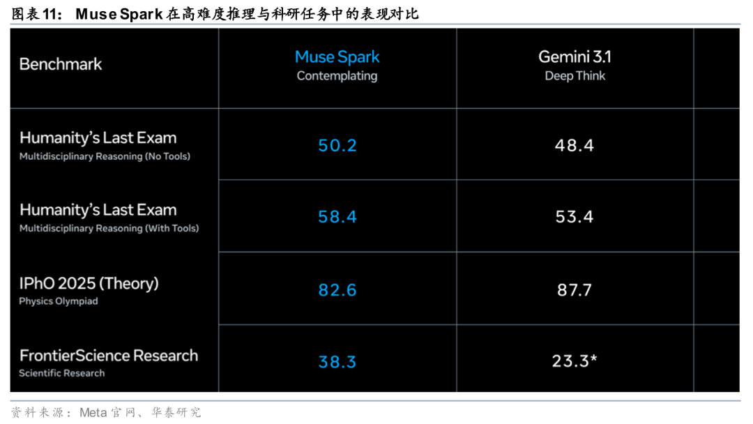 Muse Spark围绕高频消费场景强化平台内商业转化能力。Meta对Muse Spark的应用布局更侧重高频消费场景与平台内商业转化。据Meta AI官网4月9日博客,Muse Spark当前已在Meta AI中落地,并向精选合作伙伴提供API私有预览,后续计划开源其后续版本;在具体应用层面,1)“沉思模式”通过多个并行推理代理协同处理复杂科学与推理查询,体现长链路任务调度能力。2)“购物模式”可识别Meta应用内的创作者、品牌与风格内容,并转化为推荐结果,显示模型与广告、电商及内容分发链路的结合。3)在健康场景中,Meta与1000多名医生合作构建训练数据,使模型能够生成交互式展示,并对健康信息进行解析与解释。整体来看,Meta此轮推进更强调模型能力对社交平台、内容分发与商业生态的直接支撑,而非优先发展独立模型服务收入。
