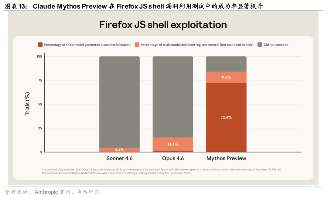 Mythos在多类复杂任务场景中实现能力跃升。据Anthropic官网披露,Mythos在软件工程、推理、computer use、知识工作与科研辅助等方向均较此前模型明显提升,其中软件工程Agent能力达到93.9%/77.8%/87.3%/59%,分别对应SWE-bench Verified、Pro、Multilingual与Multimodal;在Terminal-Bench 2.0中取得82%,反映其在CLI环境下多步操作、纠错与工具协同方面的执行深度进一步增强。Anthropic官网system card亦指出,Mythos Preview相较Claude Opus 4.6在多项评测中表现提升,并被定义为能力更强的前沿模型之一。整体来看,模型评价重点正由单点能力指标转向复杂任务的整体交付能力。