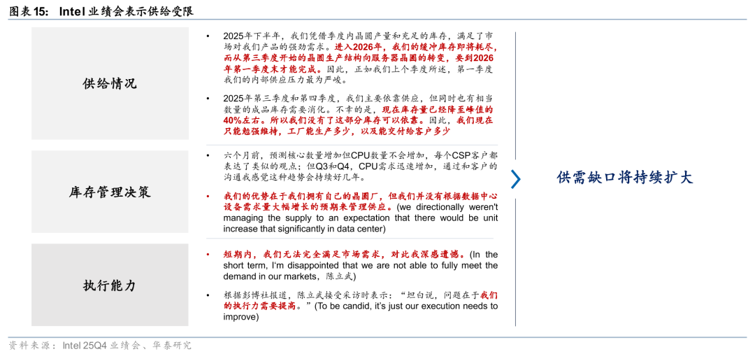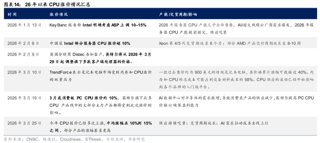 Intel/AMD服务器CPU供需缺口持续扩大。26年以来,CPU市场供需失衡持续恶化,Intel与AMD上调产品价格。1)价格端:26年2月6日,根据路透社报道,Intel和AMD已通知中国客户服务器CPU供应短缺,Intel服务器产品在中国价格普遍上涨10%以上,交货周期可能长达6个月;3月25日,根据日经亚洲报道,26年以来CPU报价已多次上涨,平均涨幅在10%-15%之间,部分产品涨幅更高,Intel和AMD分别从3月和4月起提高所有CPU的价格。2)供给端:Intel管理层在1月业绩会上坦承库存已降至峰值40%左右,现有工厂产出即为最终交付量,由于6个月前对CPU需求的判断失误、执行能力仍有待提高,短期内无法完全满足市场需求。