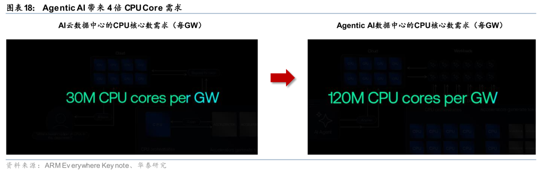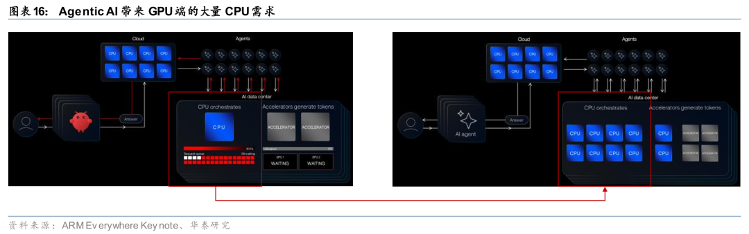 GPU算力高速扩张之下,CPU成为Agentic AI工作流中的关键瓶颈。 Agentic AI的运行逻辑决定了CPU需求结构性扩张,因为Agent在执行任务时不仅生成Token,还需要在CPU侧完成任务编排、工具调度、反馈循环等串行计算,而这些任务无法被GPU并行替代。ARM在ARM Everywhere会议上指出,Chatbot时期,CPU承担的功能与云时代类似,用于用户与GPU端AI的信息调度,但是Agentic AI时代,GPU端Agent和Agent之间的信息调度需求大幅提升,带来GPU端的CPU需求。根据ARM给出的数据,Agentic AI使每次查询的Token消耗增长约15倍,且Agent全天候24小时不间断运行,将产生远超传统云请求量级的CPU调度压力。由此带来的结果是:数据中心正面临CPU侧的结构性供应缺口,与GPU算力的快速扩张形成不对称失衡。