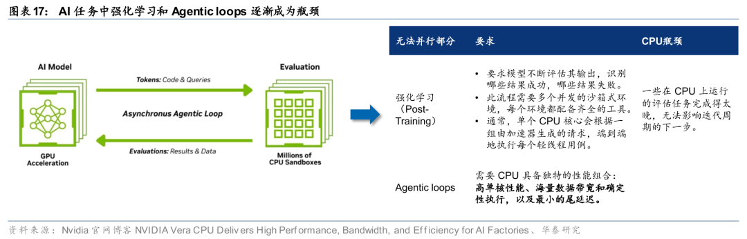 Nvidia正式披露Vera CPU机柜方案,CPU算力进入机架级部署时代。Nvidia于26年GTC大会上披露,Vera CPU可作为独立计算节点部署,并推出面向AI工厂场景的Vera CPU机架产品。Nvidia指出,系统性能的提升上限受限于无法被并行的部分(阿姆达尔定律),而在当前的AI任务中,无法被并行的部分主要是Post-Training中强化学习部分和推理过程中Agentic loops部分,CPU执行密集型串行任务的能力正在成为AI任务的瓶颈。因此,每个AI工厂都需要数百万个CPU核心来支持强化学习和工具使用的Agent循环,Vera CPU机架旨在通过机架级部署缩短建设时间、加快新容量上市速度。
