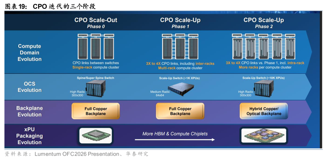 CPO出货节奏逐步明确,Scale out先行、Scale up跟进。Lumentum给出CPO发展的三个阶段,当前的阶段0在Scale out网络中使用CPO,同时在更高的聚合层如Spine和SuperSpine使用OCS,时间可能在26年末;之后的阶段1将形成多机柜的Scale up域,在机柜间的Scale up部分引入CPO,CPO需求将是Scale out部分的3-4倍,时间可能在27年末;未来的阶段2,光纤将进入机柜内部,带来相对阶段1的3-4倍CPO需求,28年底有望看到这部分的增量。26年3月初,Lumentum和Coherent陆续与Nvidia达成20亿美元合作,内容均与CPO相关,根据投资协议,Nvidia几乎拿走Lumentum现阶段所有可制造的UHP产能。我们认为,Scale out率先贡献收入、机柜间和未来机柜内的Scale up带来更大量级增量的节奏已较为清晰,看好相关厂商的收入爬坡。