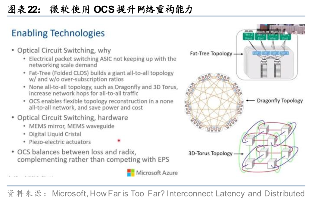 Scale out/Scale across域:除了此前已有应用的替代Spine/SuperSpine电交换机、作为冗余硬件设计提升网络弹性外,参考Coherent CTO Julie Sheridan Eng的表述,OCS不是对电交换机的简单替代,而更适合被理解为数据中心的一种新能力,用户可以通过软件指令重新定义GPU之间的光纤连接关系。基于这种新的理解,我们注意到一些新的应用,例如微软使用OCS参与数据中心间连接的构建,Dragonfly和3D Tour网络相比传统的Fat-Tree网络更稀疏,OCS动态重构的能力帮助网络在需要的时候获得临时的全互联能力,从而相较Fat-Tree节省功耗和成本。