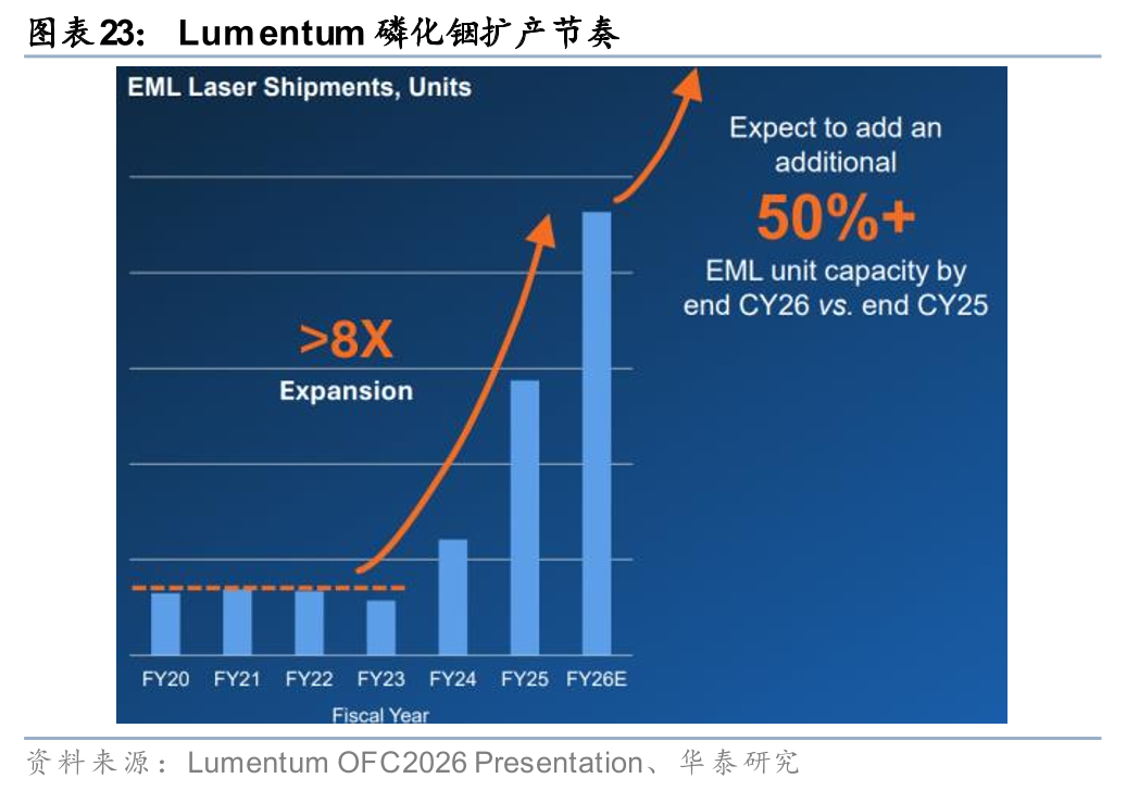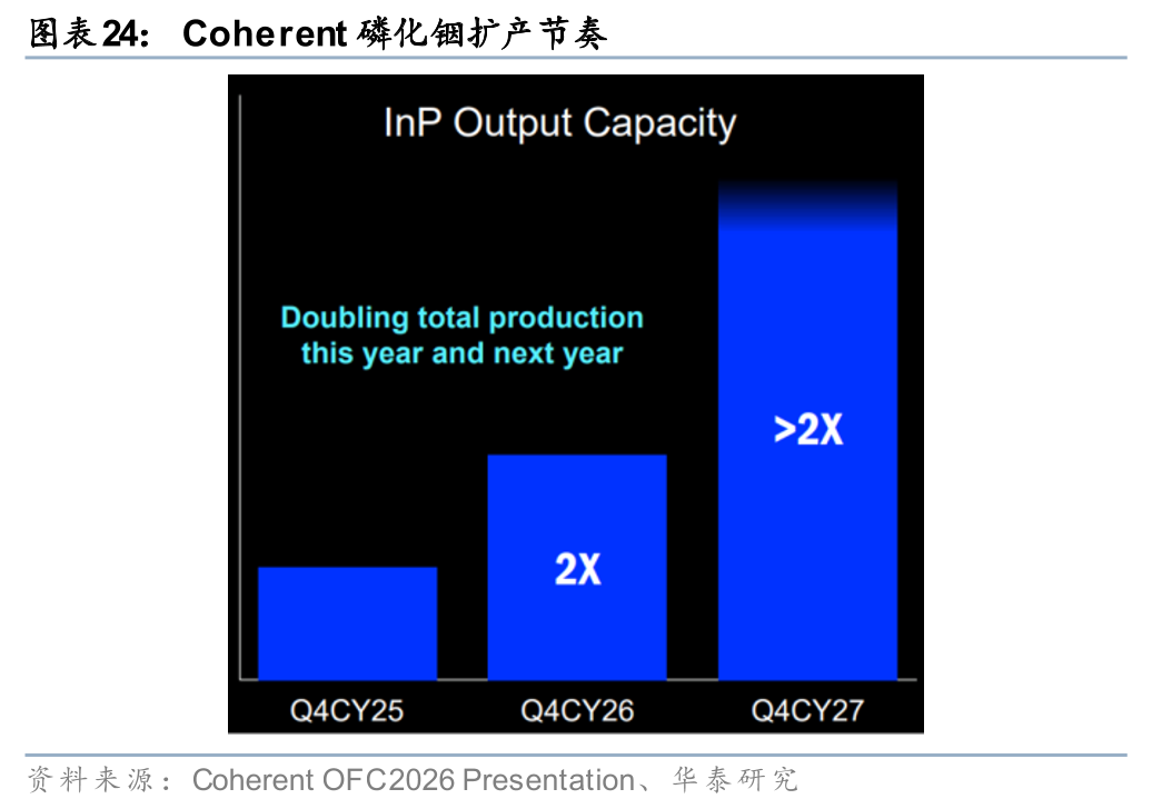光芯片产能供不应求,磷化铟扩产进入加速周期。Lumentum在OFC 2026上表示,自23年以来公司EML产能已提升8倍,以25Q4末为基准、至26Q4末磷化铟产能将再增50%,但市场供需缺口目前仍约为25-30%,并预计未来几年随Scale out与Scale up双轮驱动持续扩大,公司激光器芯片(EML、CW)及UHP产品backlog均超过两年。公司宣布完成第五座磷化铟晶圆厂的收购,预计28年开始出货。Coherent在OFC 2026披露,公司目前运营四座磷化铟晶圆厂,预计到26年底整体产能较25年底翻倍,27年底再翻倍或更多,新增产能几乎全部以6英寸产线为主。我们认为,磷化铟光芯片供需缺口短期内难以收窄,Lumentum和Coherent均已提前锁定多年期backlog,光芯片供应商有望在本轮AI互联需求扩张中持续受益。