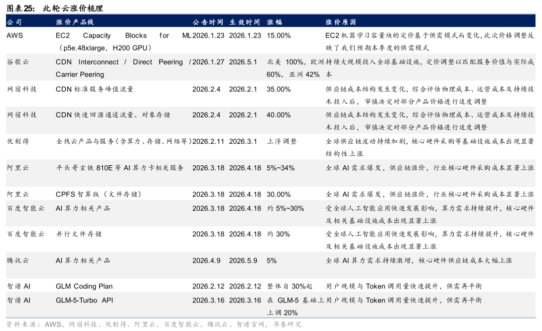 本轮云计算提价从CDN边缘节点扩散至全线云产品,正式进入结构性涨价周期。2026年1月,海外云巨头率先打破近二十年降价惯例,高端算力卡与CDN等成为首批提价品类。 AWS于1月中旬上调EC2 Capacity Blocks for ML价格,反映弹性GPU预留资源供需率先承压,该品类采用按预订时点动态定价机制;1月27日谷歌云确认自5月1日起上调CDN Interconnect、Direct Peering等出网单价,北美涨幅达100%、亚洲约42%,为其近二十年来首次对基础云服务大幅提价。2月初,国内开始跟进,路径从CDN/存储向AI算力逐步蔓延。2月4日,网宿科技对部分CDN与存储产品调价,最高涨幅约40%;优刻得2月11日发布公告,自3月1日起对全线产品与服务价格上浮,为国内首家发布正式全线涨价公告的云厂商。3月18日,阿里云与百度智能云在同日宣布上调AI算力与存储产品价格——阿里云平头哥真武810E等算力卡涨5%~34%、CPFS智算版涨30%,百度智能云AI算力产品涨约5%~30%、并行文件存储涨约30%。4月9日,腾讯云宣布AI算力相关产品服务上调5%,容器服务TKE-原生节点相关产品服务上调5%,EMR相关产品服务上调5%。
