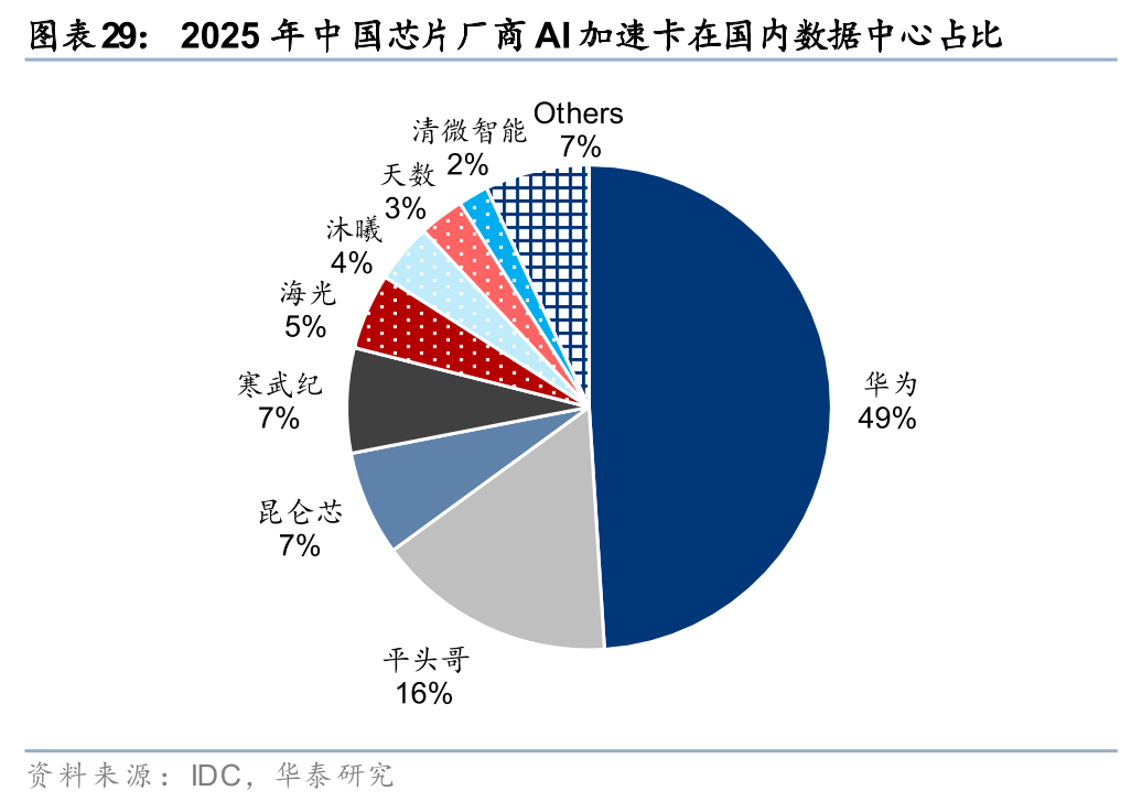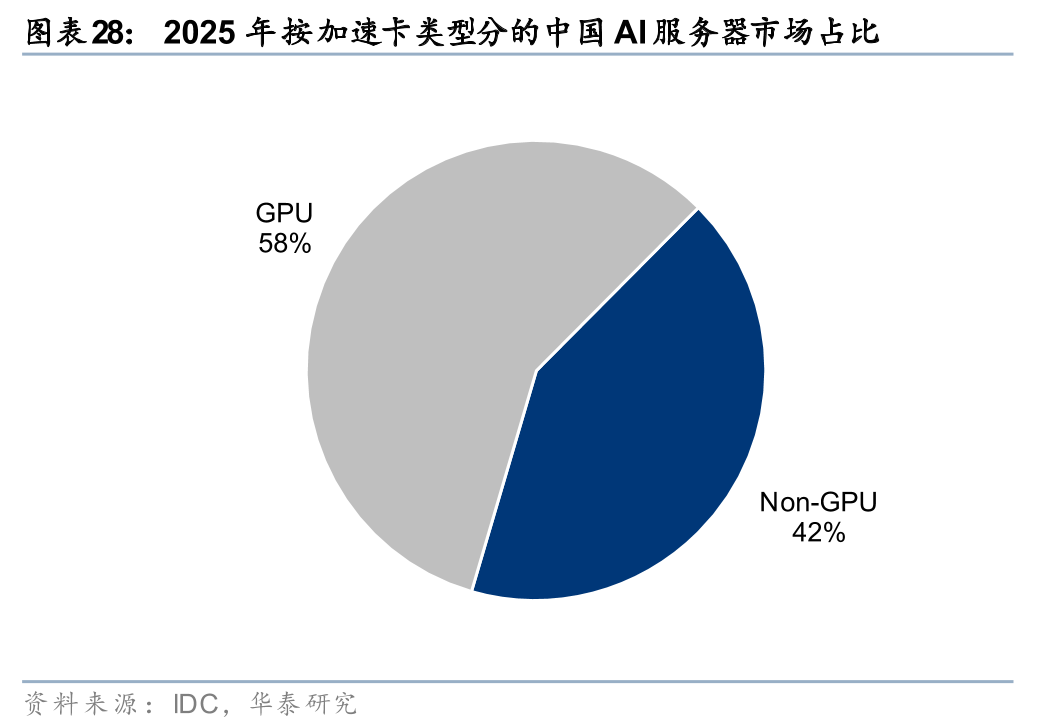 2025年,国产AI加速卡市场份额已超过40%,非GPU芯片凭借差异化技术路线加速追赶。根据IDC数据,2025年中国AI加速卡市场总出货量约为400万张,其中本土芯片厂商合计出货约165万张,市场份额接近41%。从厂商表现看,华为以约81.2万颗的出货量显著领先,平头哥位居第二,昆仑芯与寒武纪并列第三,海光信息、沐曦、天数智芯等厂商也保持在市场前列。相比之下,曾长期主导国内市场的英伟达出货量约为220万颗,市场份额明显回落。与此同时,非GPU加速卡在AI服务器市场中的占比已超过40%,表明以差异化架构为代表的非GPU技术路线,正成为我国推动AI算力自主可控的重要增长方向。