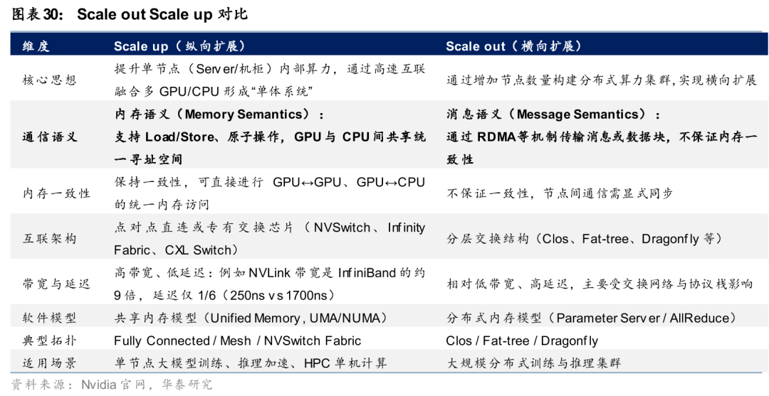 Scale up与Scale out的核心差异在于内存一致性,由此带来带宽与延迟的差异。Scale up侧网络支持内存语义(Load/Store)访问与原子操作,可进行GPU与GPU、GPU与CPU间的统一内存寻址,保证内存一致性,通过点对点或者专有交换芯片进行传输;而Scale out侧为消息语义,通过RDMA(远程直接内存访问)进行数据传输,架构一般为Clos、Fat-tree、Dragonfly等分布式拓扑。因此两者在带宽与时延上存在显著差异,以英伟达的系统为例,Scale up的NVlink传输带宽比其最快的Scale out InfiniBand网络高9倍,前者延迟(250ns)仅为后者(1700ns)的1/6。伴随模型参数的扩大与推理算力需求的起量,模型的推理范式发生了变化,体现为内存墙带来的显存池化的需求与并行策略带来的高通信需求,使得Scale up网络的重要性不断提高。下面从模型推理过程的原理出发,阐明为什么需要Scale up网络。