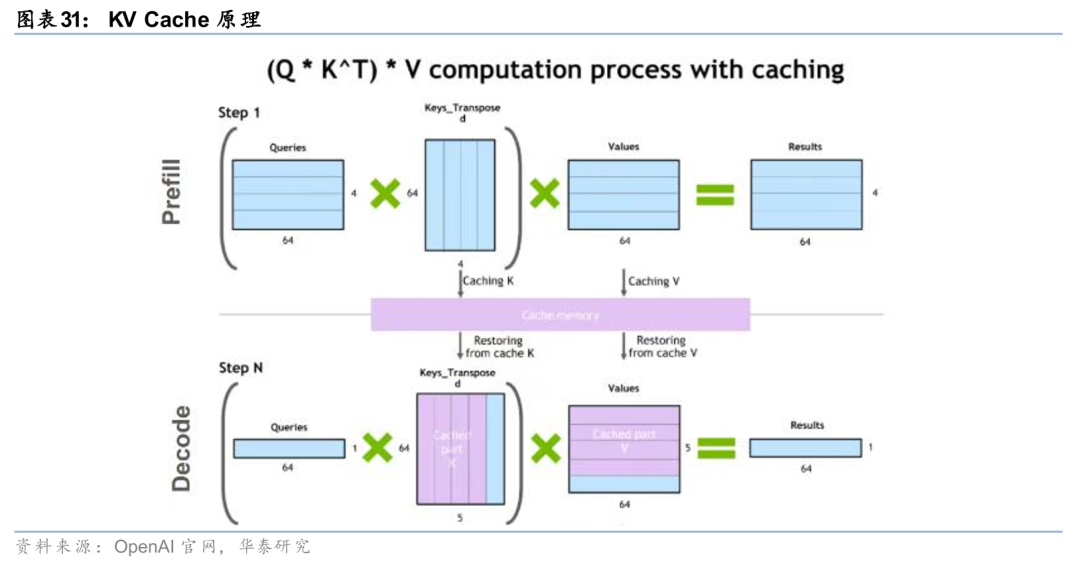 拆解推理环节的技术原理,KV Cache需要大量显存。在Transformer的自注意力(Self-Attention)机制里,每个Token都会生成三种向量:Q(Query)、 K(Key)、V(Value),在Transformer生成文本时,每次只会生成一个新Token,模型会用这个Token的Q去和所有历史Token的K做匹配,找到相关性,然后用这些相关的V计算输出,在这个过程中为了避免重复计算催生了KV Cache。KV Cache的原理是将历史的K与V进行存储,无需每次重复计算,将推理的计算量从二次方降低为线性。在这个过程中需要大量的显存来支持, KV Cache占用显存大小可达模型的50%以上。假设一个模型上下文长度是8万个Token,而每个Token的K和V都要储存,那么KV Cache就能占用几十GB的显存。