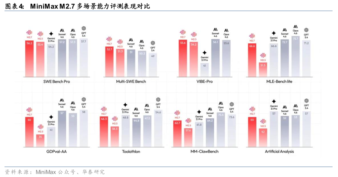 MiniMax推动模型参与自身演进形成研发闭环。MiniMax本轮迭代的核心在于模型参与自身研发过程。据MiniMax官网3月18日发布信息,M2.7能够构建复杂Agent Harness,并通过Agent Teams、复杂Skills与Tool Search完成高复杂度生产力任务;在模型训练过程中,M2.7被用于更新memory、辅助强化学习实验并反向优化Harness与训练流程。同时,官网披露M2.7在SWE-Pro、VIBE-Pro、Terminal Bench 2及GDPval-AA等任务中表现较好,体现出其在软件工程与专业场景中的综合交付能力。