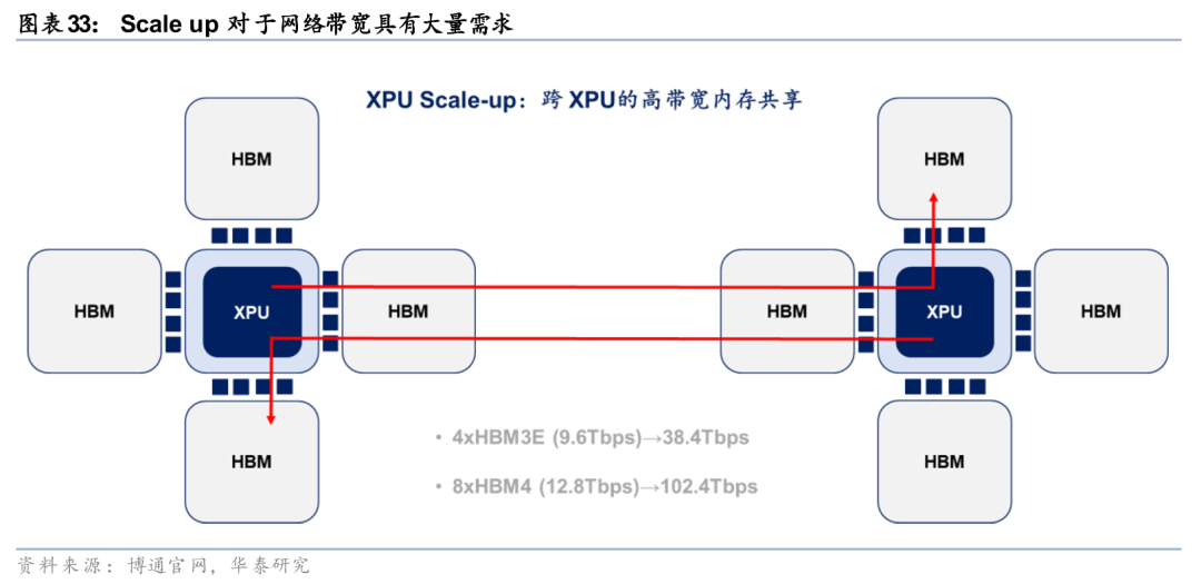 XPU间的内存共享对于网络带宽具有大量需求。加速器处理器(XPU)应能像访问本地内存一样,对远程加速器内存执行加载/存储操作。以单个XPU的内存带宽需求为例,每个XPU通常配备4个HBM(高带宽内存),每个HBM与XPU连接的带宽大约为每秒9.6TB,那么4个HBM的总带宽约为40TB。下一代XPU将配备HBM4,并且可能拥有多达8个HBM,这样一来,每个XPU连接的内存总带宽将达到约100TB。在一个包含两个XPU的系统中,如果一个XPU的计算任务需要访问另一个XPU的内存,那么在未来就需要100TB的带宽。