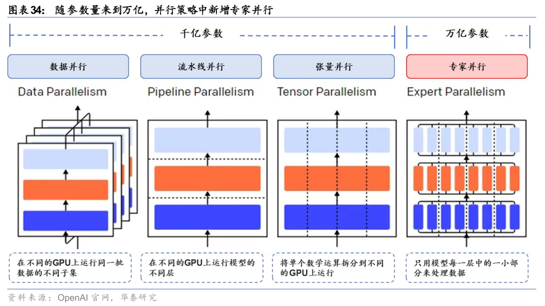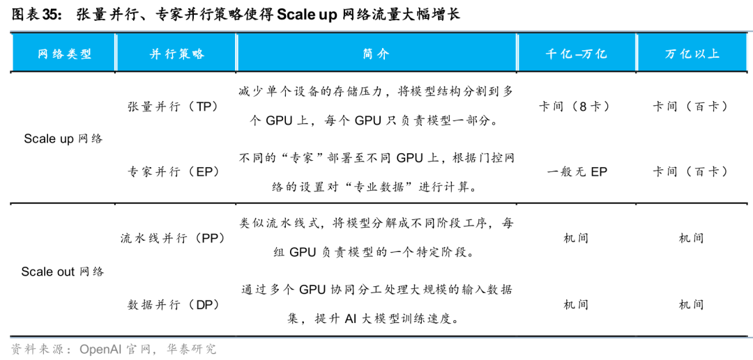 张量并行与专家并行策略对卡间通信提出了更高的要求。千亿参数模型主要包含数据并行、张量并行与流水线并行三种策略,其中张量并行将模型参数运算的矩阵拆分为子矩阵传输至各个负载,各负载分别进行不同的矩阵运算,在每一层神经网络的计算后都需要将新的计算结果收集、汇总,并将完整结果重新分发,对通信要求更高。随着训练/推理任务规模扩大,超万亿参数模型的训练与推理中新增专家并行策略。专家并行的数据量非常大,通常在MB级~GB级,同时,对时延极为敏感,任何微小延迟都会引发等待与算力浪费(每增加10μs时延,GPU利用率将下降1%至3%),因此专家互联对高带宽和低时延提出了更高的要求。