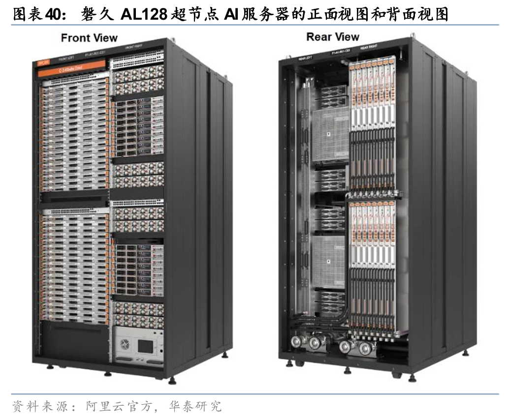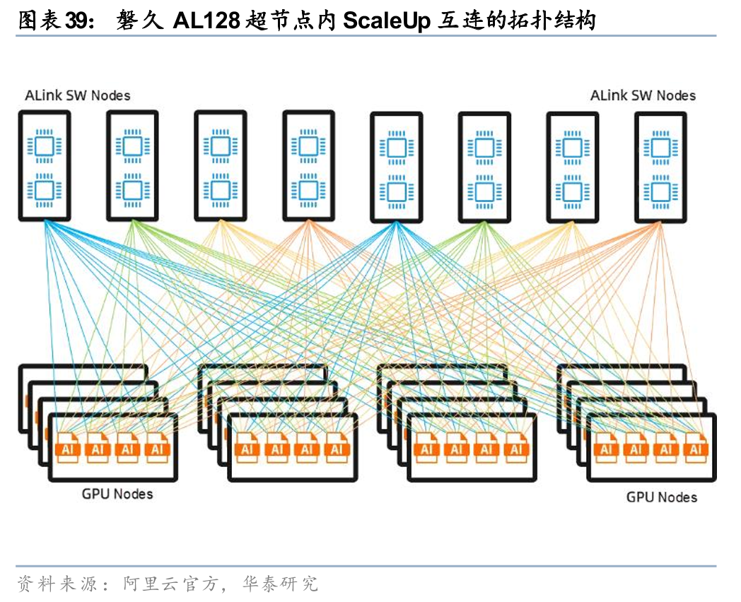 阿里云磐久AL128超节点于2025年9月18日在2025杭州云栖大会正式发布。阿里磐久AL128超节点采用模块化多维解耦架构,单柜为定制双宽液冷机柜,支持128–144颗AI芯片、350kW供电与500kW散热(单GPU 2kW液冷),内部以自研非以太ALink单级交换(兼容UALink/NVLink/xLink/UB等)实现Pb/s级Scale up带宽、百ns级时延,集成CIPU 2.0 EIC/MOC网卡,搭配HPN 8.0 800G高性能网络,可支撑单集群10万卡级训练,相比传统架构推理性能提升50%,核心目标是在大规模AI场景中实现高带宽、低时延与算存协同优化。磐久AL128超节点2025年Q4起在阿里云内部万卡级商用,并已落地短视频、金融、自动驾驶等外部客户,同时在三江源智算中心大规模部署平头哥PPU国产算力集群。