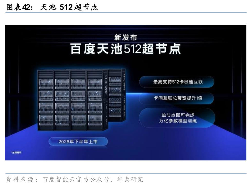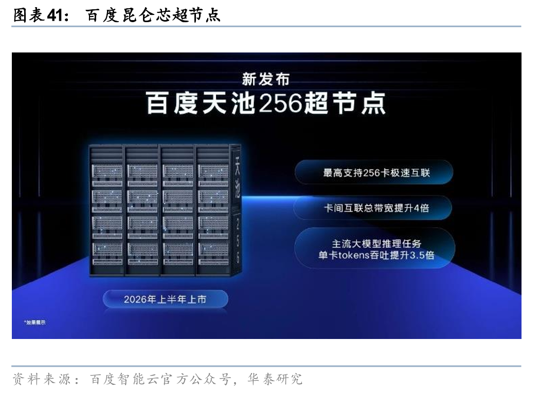 百度昆仑芯超节点于2025年4月在Create 2025百度AI开发者大会发布。8月28日在百度云智大会随百舸AI计算平台5.0正式商用上线;采用天池高密液冷整机柜、32卡一层点对点全互联架构,单柜集成64张昆仑芯P800 XPU,卡间互联带宽提升8倍、时延低至1.5μs,单柜训练性能提升10倍、单卡推理性能提升13倍;2025年4月起已在百舸5.0大规模部署,支撑3.2万卡昆仑芯P800集群,服务文心大模型训练推理及金融、央企、自动驾驶等外部客户,2025年11月13日百度世界大会发布新一代天池256/512超节点(2026年上市),分别支持256/512卡全互联,天池512可独立支撑万亿参数模型训练。