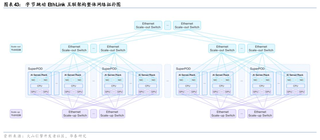 字节跳动已对外披露其面向GPU超节点的自研互联方案EthLink。该方案主要服务于GPU Scale up(节点内及AI Rack内)高速互联场景,适用于单机服务器及AI Rack内8卡及以上GPU部署。在架构设计上,EthLink基于原生以太网深度优化,同时支持GPU基于Load/Store内存语义的小数据块、低时延同步通信,以及基于RDMA消息语义的大数据块、高带宽异步传输,从而为GPU超节点提供专用高速互联能力。结合字节跳动同期披露的集群网络能力,其配套vRDMA网络公开指标可达最高320Gbps带宽、最低约5微秒时延、最高50M PPS,反映出字节在超节点内部互联与大规模集群网络协同方面已形成较为系统的技术布局。
