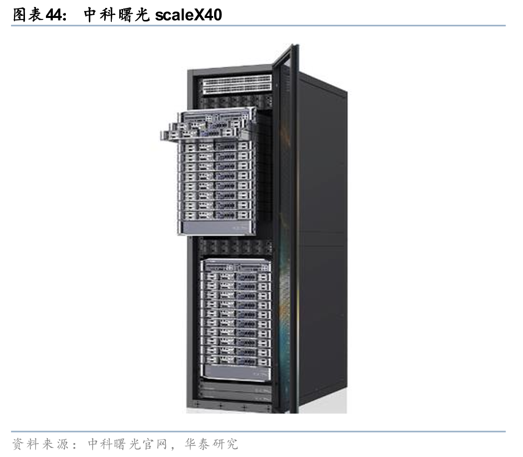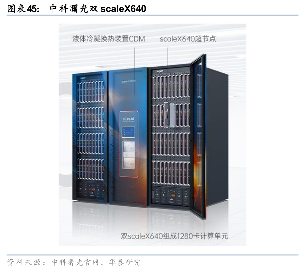 中科曙光超节点包含两大核心系列:1)scaleX640于2025年11月6日在世界互联网大会乌镇峰会发布,采用 “一拖二” 紧耦合整机柜、浸没相变液冷、超高速正交互联架构,单机柜集成640张GPU、算力密度提升20倍、支持10万卡级集群扩展,2025年底起在国家智算中心、金融、科研机构规模化部署;2)scaleX40于2026年3月26日在中关村论坛发布,为全球首款 无线缆箱式超节点,采用 正交无线缆一级互联、标准19英寸箱式设计,单节点集成40张GPU、FP8算力 ≥28PFLOPS、HBM显存 ≥5TB、时延百ns级、于2026年4月启动交付,适配企业级AI训练与推理。