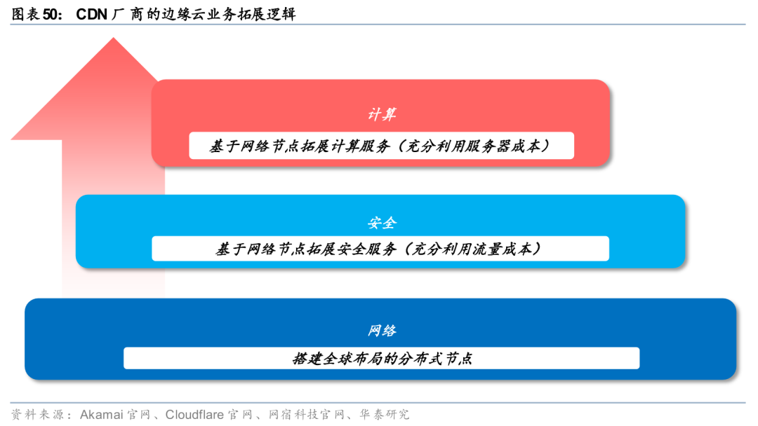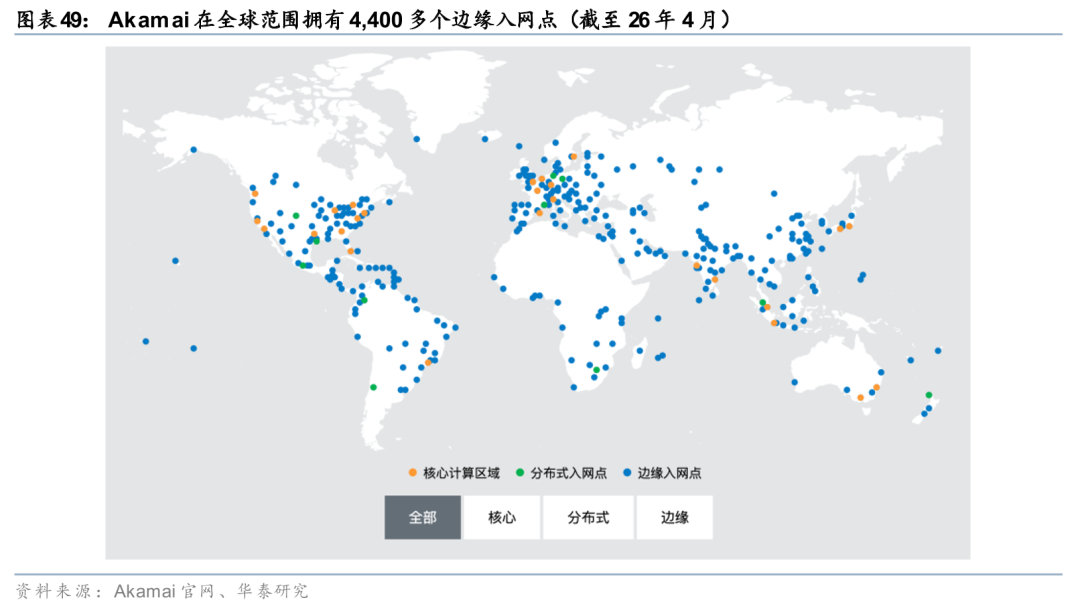 CDN厂商拥有全球分布式节点网络,加速业务从“内容分发”向“计算执行”拓展。边缘云市场主要参与者包括公有云厂商、CDN厂商、NeoCloud厂商等玩家。公有云厂商仍是云计算的核心主体,其切入边缘云的逻辑是从中心云向外延伸,构建“云-边一体化架构”;NeoCloud是AI时代新兴的云基础设施提供商,其边缘云业务的核心切入点是“高性能GPU算力”;CDN厂商是边缘云最直接的参与者,其优势源于长期积累的分布式网络基础设施与流量入口控制能力。我们认为,CDN厂商有望加速实现业务从“内容分发”向“计算执行”的自然延伸。