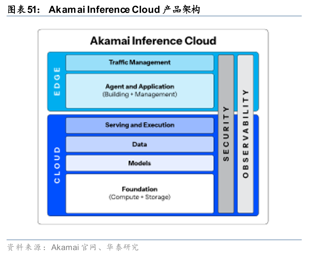 Akamai拥有全球最大CDN网络,22年收购Linode发力边缘云市场。Akamai是全球最大的CDN服务商,业务覆盖全球130多个国家和地区,覆盖全球1,200 网络,拥有4,400多个边缘入网点。22年公司收购Linode(开发者导向的IaaS云厂商),实现原有网络的计算能力拓展,开始业务的分布式云平台转型,21年-25年公司云计算收入占比从7.31%提升至16.83%,根据Visible Alpha预测,26年公司云计算收入占比有望提升至18.85%。针对AI推理场景,25年公司推出Akamai Inference Cloud产品,底层算力与Nvidia合作(NVIDIA Blackwell GPU、BlueField-4 DPU),为AI客户提供Agent多步推理、智能调度等计算服务。25年Akamai Inference Cloud初步在全球20个地区上线。
