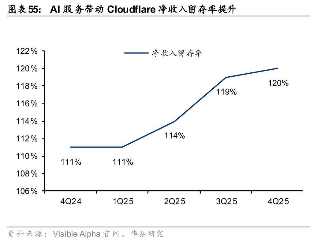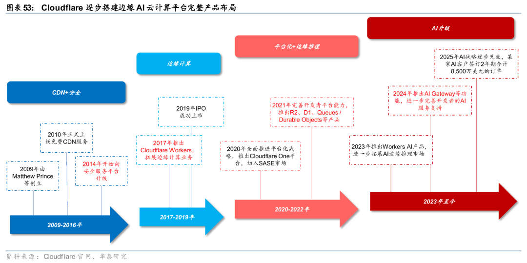 Cloudflare战略定位边缘AI云计算平台,全面推进边缘云业务转型。以边缘AI云计算平台为战略定位,Cloudflare已形成包括计算(Workers、Containers)、状态(Durable Objects)、数据(Workers KV、R2、D1)、AI(Workers AI、AI Gateway、Vector DB)、安全(Zero Trust)、网络(CDN)在内的完整产品布局。公司在AI推理场景具备先发优势,23年公司发布Workers AI(beta版),24年开放Workers AI正式商用版本,25年围绕模型生态(收购Replicate)、Agent交互、推理优化、AI安全等场景,对Workers AI进行全面升级。根据Cloudflare 25Q4电话会表述,公司正加速覆盖应用构建、流量承载、价值分配三大环节。