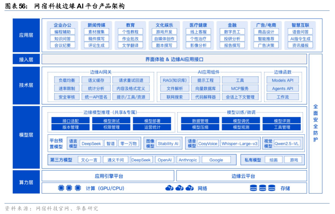 网宿科技推出边缘AI平台,提供计算、安全、AI模型的一体化服务。网宿科技(成立于2000年)深耕CDN行业二十余年,拥有全球2800 节点资源(其中国内节点2000 ,海外自有节点800 )。面向AI应用场景,公司自23年起持续推进产品升级。23年8月,公司推出GPU算力平台,基于全球分布的节点资源,提供高性能GPU算力资源;24年8月,公司推出边缘AI网关,轻松接管多种大模型;25年4月,公司对象存储全面兼容MCP协议,成为AI大模型的坚实“数据底座”;25年11月,公司发布边缘AI实时语音交互方案,为企业打造高品质、低延迟、低成本的下一代语音交互体验。公司打造的边缘AI平台,可以为客户提供包括AI计算、AI模型、AI服务中台、AI应用在内的一体化服务。