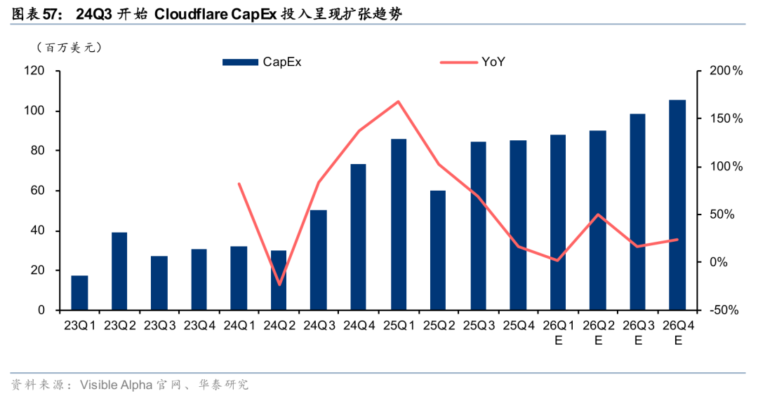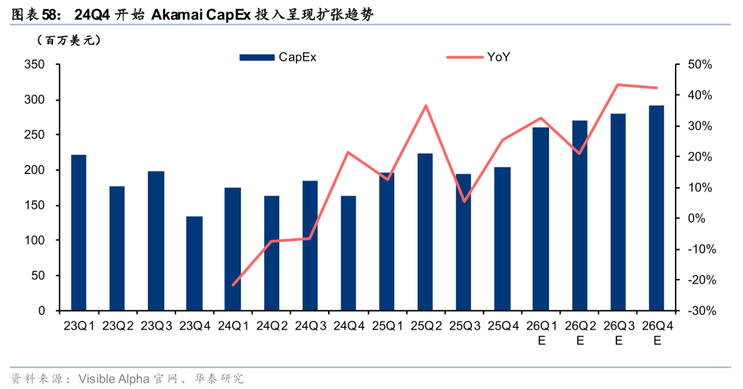 海外边缘云商业化节奏相对领先,25年Akamai、Cloudflare均收获大额订单。从商业化节奏上看,海外边缘云厂商的节奏相对领先。根据Akamai 25Q4电话会表述,公司与AI大客户签订为期4年价值2亿美元的大额订单,公司目前已部署20个Inference Cloud节点,短期内计划拓展至40个,长期目标拓展至100个;根据Cloudflare 25Q4电话会表述,公司与AI客户签订为期2年价值8500万美元的大额订单,同时收获多个百万美元级AI开发平台订单。海外边缘云业务已进入商业落地期,CDN扩大CapEx投入,25年Akamai、Cloudflare的CapEx分别为8.20、3.16亿美元,同比 19.59%、 70.57%。