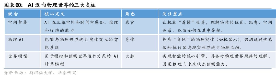 我们认为Physical AI是继生成式AI之后的最强产业主线。我们判断2026年为Physical AI规模化落地元年,人形机器人全面量产、自动驾驶L3加速落地,两大场景共振驱动行业进入高景气成长周期。空间智能赋予三维理解能力,物理AI为实体载体,世界模型为智能中枢。世界模型直击“感知-决策-执行”闭环,是Physical AI落地的核心引擎。数据是Physical AI最稀缺的生产要素,我们判断,能高效解决数据供给与虚实迁移的技术路线,将构筑最强商业壁垒,相关平台型公司具备长期投资价值。