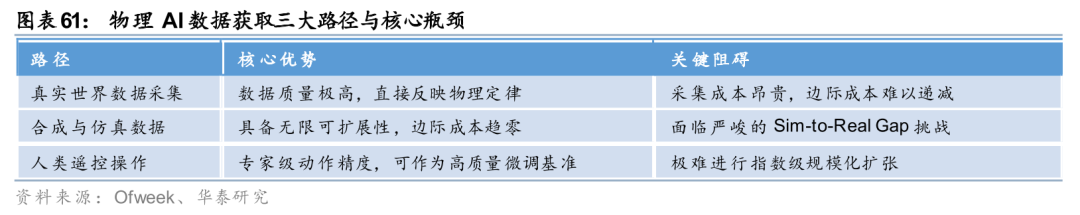数据是Physical AI最稀缺的资源。不同于大语言模型互联网世界中提供了几乎无限的文本数据,Physical AI所面对的真实世界的操控数据较为稀缺,使得数据成为整个产业链中最稀缺资源之一,行业正探索三条主要路径: