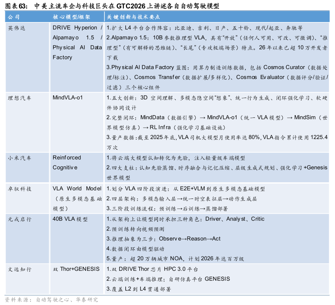 英伟达在GTC 2026大会重磅发布Physical AI全栈基础设施,覆盖L4自动驾驶平台DRIVE Hyperion、推理型VLA模型Alpamayo 1.5及Physical AI数据工厂,形成“硬件 模型 数据” 一体化解决方案。生态层面,比亚迪、吉利、Uber等国内外企业正式加入,进一步巩固其自动驾驶生态壁垒。国内厂商同步加速技术迭代,理想、小米、卓驭、元戎、文远知行等集中发布核心技术,围绕VLA架构、世界模型、生成式仿真三大方向推进研发,行业呈现两大清晰趋势:一是从模块化拼接转向原生多模态统一架构,二是由数据驱动升级为认知推理模式。