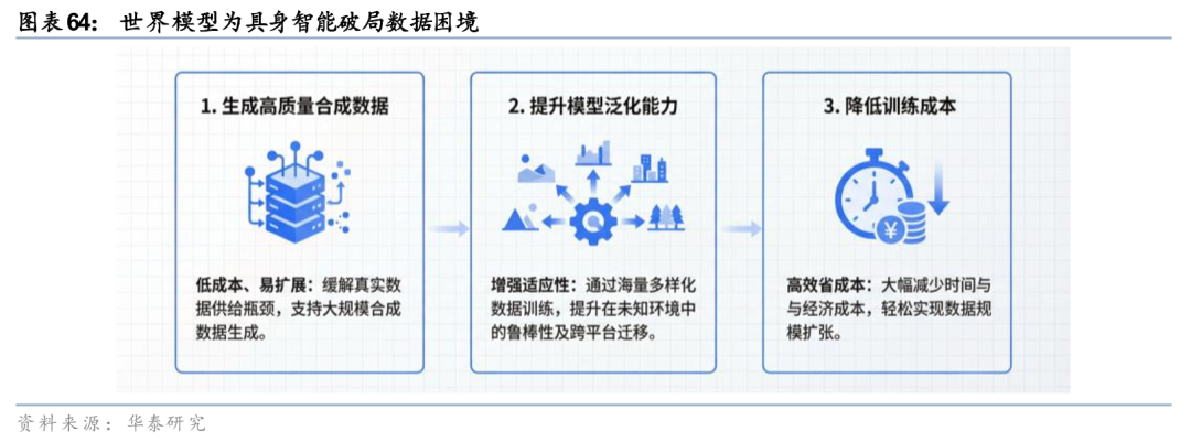 具身智能以人形机器人为核心载体,是Physical AI最活跃增长方向。具身智能现阶段发展的核心困境在于模型训练对数据的需求量大,但物理交互数据极度缺乏,世界模型为行业破局提供三重价值: