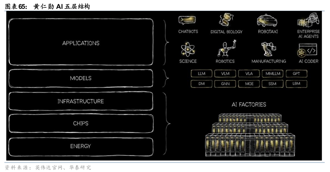 英伟达自2024年起持续引领Physical AI产业浪潮,战略布局清晰且节奏明确。2024年6月Computex大会,黄仁勋首次提出Physical AI核心概念,奠定AI向物理世界落地的产业基调;2025年3月GTC大会,公司正式发布Blackwell芯片架构、Cosmos物理AI平台及全栈技术方案,完成从底层算力到上层应用的完整布局。2026年1月CES大会,黄仁勋再度强调,Physical AI即将迎来ChatGPT时刻,将AI技术体系清晰划分为五层架构:能源、芯片、基础设施、模型与应用,自上而下构建全链路技术壁垒。该架构为Physical AI规模化落地提供底层支撑,也为机器人、自动驾驶、工业智能等下游场景打开广阔成长空间,成为全球Physical AI产业发展的核心指引。