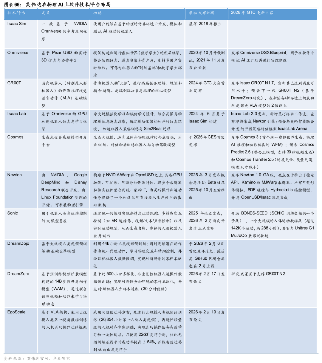 英伟达围绕Physical AI打造硬件 软件全栈闭环,技术布局深度领先。硬件端,公司推出面向边缘实时推理的Jetson Thor、IGX Thor平台,以及DGX Station桌面级AI超算,全面覆盖端侧低延迟推理与云端高强度训练需求,为物理AI实体提供充沛算力底座。软件端,构建一体化技术体系:以Cosmos实现大规模合成数据生成,依托Omniverse、Isaac Lab、Newton引擎完成高保真物理仿真训练,通过GROOT、Sonic、DreamDojo、DreamZero、EgoScale等基础模型算法支撑感知决策与动作控制,并配套自动化评估与部署工具链,形成“数据-仿真-模型-部署”完整闭环。依托该体系,机器人、自动驾驶等物理AI应用可在虚拟环境中完成全流程训练验证,以数据驱动、软件定义模式实现快速迭代与低成本优化,显著缩短产品落地周期、提升泛化能力,为Physical AI规模化商用奠定核心技术基础。