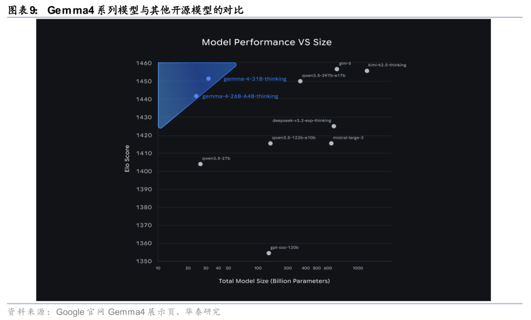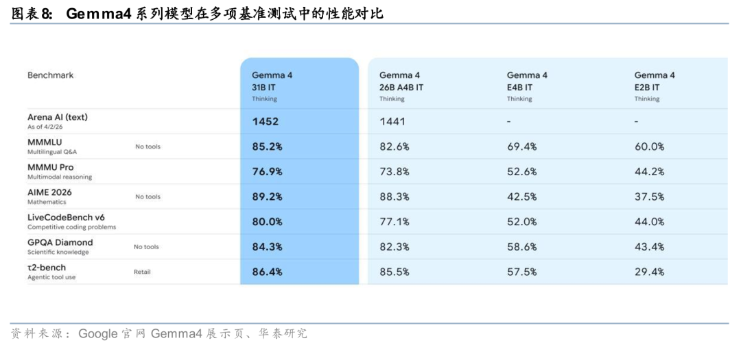 开源模型Gemma 4通过多规格与工具能力下沉扩大开发者生态。Google在开源侧同步推进模型能力扩散。据Google官网4月2日发布信息,Gemma 4沿用Gemini 3同源研究成果,采用Apache 2.0许可,提供31B Dense、26B MoE、E4B与E2B四个尺寸,其中大模型支持最高256K上下文,并原生支持函数调用与结构化JSON输出,边缘侧小模型则强调离线运行、低时延及音频输入能力。官方同时披露,31B模型在Arena AI开源模型文本榜单位列第3,26B模型位列第6,并可在单张80GB H100上运行未量化权重。整体来看,Gemma 4通过模型规格分层与工具能力下沉,推动Agent开发能力向更广泛开发者群体扩展。
