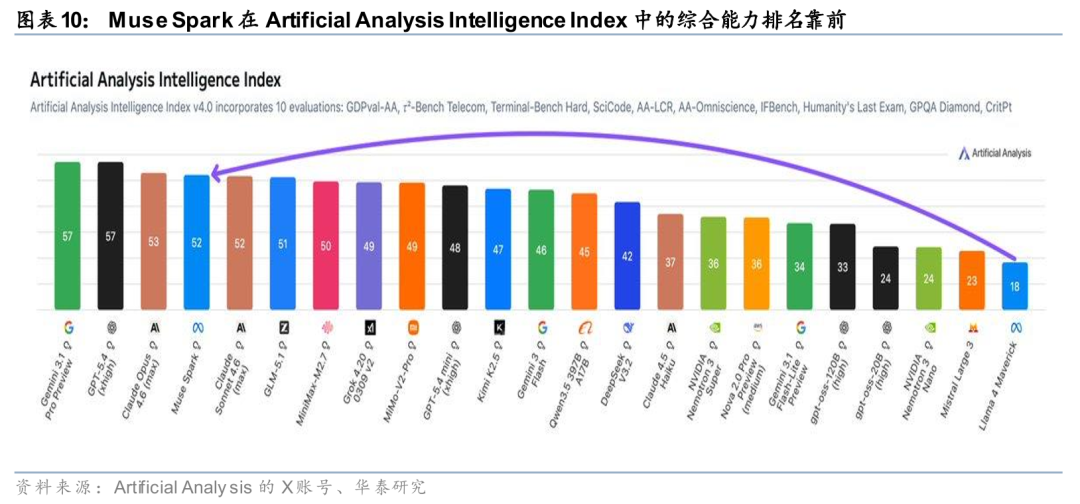 Meta通过Muse Spark推动模型能力与自有流量场景的深度融合。据Meta AI官网4月9日博客,Muse Spark为Meta Superintelligence Labs推出的首个前沿模型,定位为原生多模态推理模型,支持文本与视觉输入、文本输出,并具备工具使用、视觉思维链及多代理编排能力;据文中转引Artificial Analysis信息,该模型采用专有许可,发布时未开放公开API,但已开始整合至Meta AI以及Facebook、Instagram和Threads等一方产品。同时,Meta在过去9个月中重建预训练栈,对基础设施、模型架构与数据管道进行系统升级,并表示相较此前的Llama 4 Maverick,可用更少计算实现相近能力。