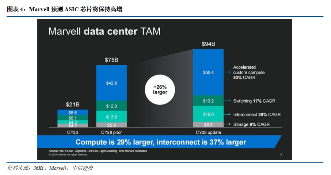 AI大模型从训练侧向推理侧转向,Token成本已成为制约AI企业业务扩张的核心瓶颈。传统通用GPU(如英伟达)虽然在生态上占据绝对优势,但在AI推理端日益凸显的性能-成本缺口对大模型服务商形成了一定掣肘。ASIC芯片凭借在特定负载下更优的能耗比、极具针对性的定制化能力以及去除了多余冗余计算的特性,正成为大幅降低单Token推理成本的最优解。根据Marvell预测,2023-2028年全球AI ASIC市场规模将从66亿美元跃升至554亿美元,年复合增长率高达53%。中长期来看,随着AI应用规模化落地,算力基础设施的建设逻辑将从训练算力向推理效率转变,将显著提振市场对ASIC芯片的需求。
