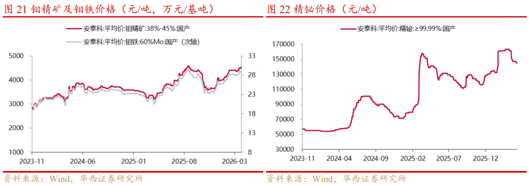 需求端由传统特钢、新能源、军工高端制造三轮驱动,常规需求稳健增长,光伏 HJT 钼靶材、风电高端特钢等新兴赛道需求快速放量,而军工领域因钼具备超高熔点、高强度、耐高温腐蚀特性,是装甲钢、火炮身管、导弹壳体、航空发动机高温合金不可或缺的核心原料,属于典型 “战争金属”,在地缘冲突升级背景下需求弹性显著放大。