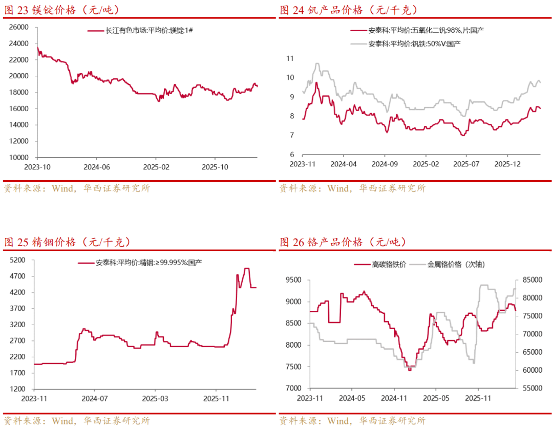 镁锭价格较上周下跌0.79%至18,740元/吨。供应端,原材料兰炭及硅铁价格波动收窄,虽然主产区工厂面临一定的利润收缩压力,但整体开工率保持稳定,市场现货供应充足;需求端,表现依然偏冷清,下游铝合金及压铸行业采购节奏延续按需补库,由于内外贸订单增量有限。整体来看,当前镁市受制于终端消费复苏不及预期,短期内镁价缺乏向上反弹的强力动能,预计维持窄幅波动格局。