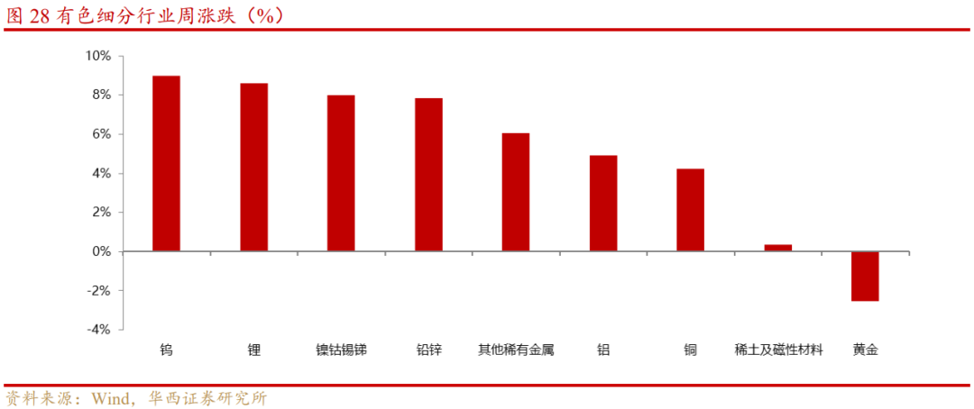 从细分行业看,钨、锂、镍钴锡锑、铅锌、其他稀有金属、铝、铜、稀土及磁性材料分别上涨8.98%、8.61%、8.00%、7.83%、6.06%、4.93%、4.21%、0.34%;黄金下跌2.53%。
