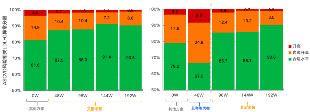 动脉粥样硬化性心血管疾病(ASCVD)高风险人群比例,从基线的3.5%降至192周的0.9%,降幅达74%;从非核苷方案转换为含整合酶抑制剂方案后,LDL-C升高人群比例从3.2%升至8.2%(升高2.6倍),而再次转换为艾诺米替后,这一比例从8.2%降至0.9%,降幅达89%。