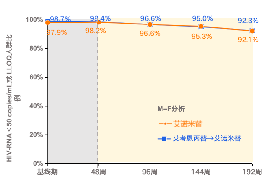 研究数据[1-3]显示,192周时,艾诺米替组病毒抑制率(HIV RNA < 50 copies/mL或LLOQ)持续高于92%;无论是从非核苷方案转换,还是从含整合酶抑制剂方案转换的受试者,均维持了稳定、高水平的病毒抑制。