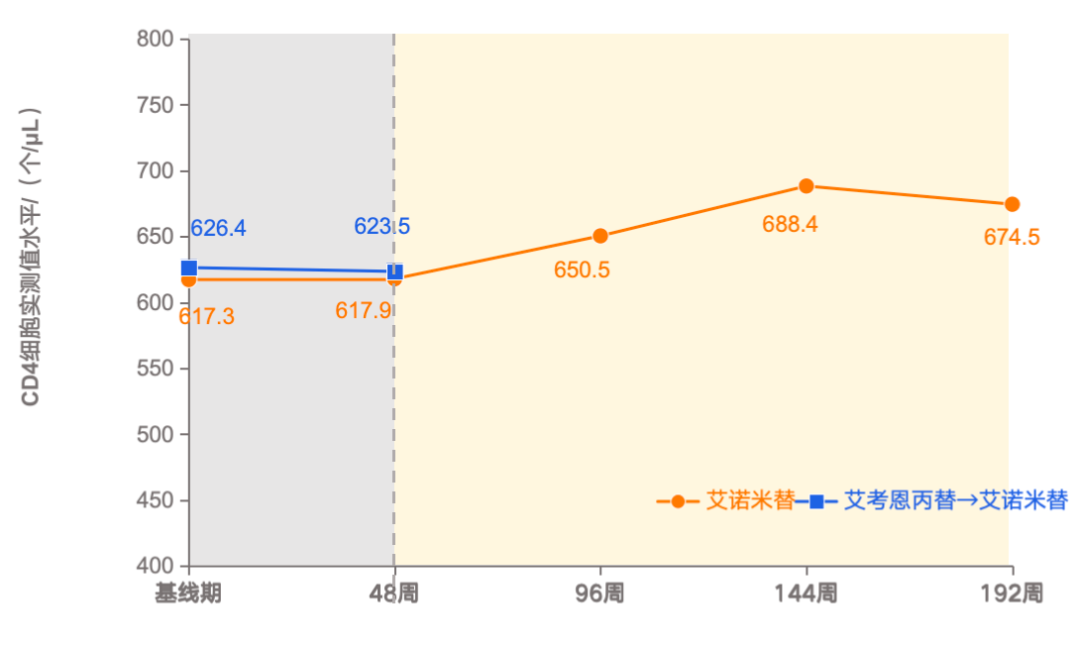 研究数据[1-3]表明,自基线至192周,艾诺米替组、自艾考恩丙替转化为艾诺米替组CD4细胞计数均在持续上升后保持稳定,且免疫重建不全(CD4<350)人群比例分别由9.2%下降至6.1%,由7.1%下降至6.2%,提示艾诺米替不仅“压制病毒”,还可帮助患者稳定重建免疫功能,降低机会性感染风险。