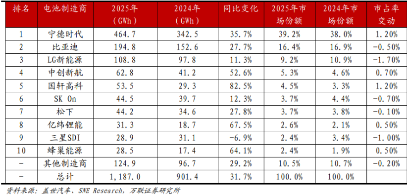 2025年,动力电池方面宁德时代的市场份额依然维持增长势头,市占率上升1.2%至39.2%;