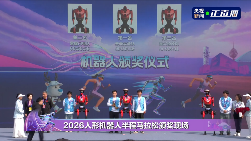 在4月19日举办的2026北京亦庄人形机器人半程马拉松上,荣耀“闪电”机器人包揽了前六名!其中,齐天大圣队以超越人类半程马拉松世界纪录的50分26秒(净用时)获得冠军。不仅如此,荣耀“闪电”机器人更是包揽了赛事的前六名。