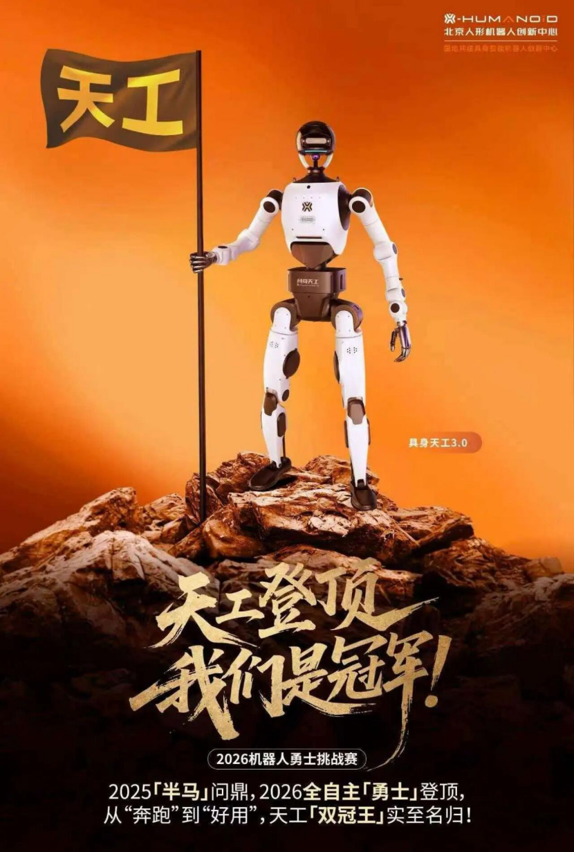 在马拉松前一天的的首届北京亦庄机器人勇士挑战赛上,北京人形机器人创新中心(简称“北京人形”)旗下具身天工3.0以全程无遥控、无预设、全自主完成摆锤穿越、开拓前行、破门清障等高难度赛项,凭借最高积分斩获全球首个全自主机器人勇士挑战赛冠军,并荣获勇士智行奖,加冕“马拉松 勇士挑战赛”双冠王。
