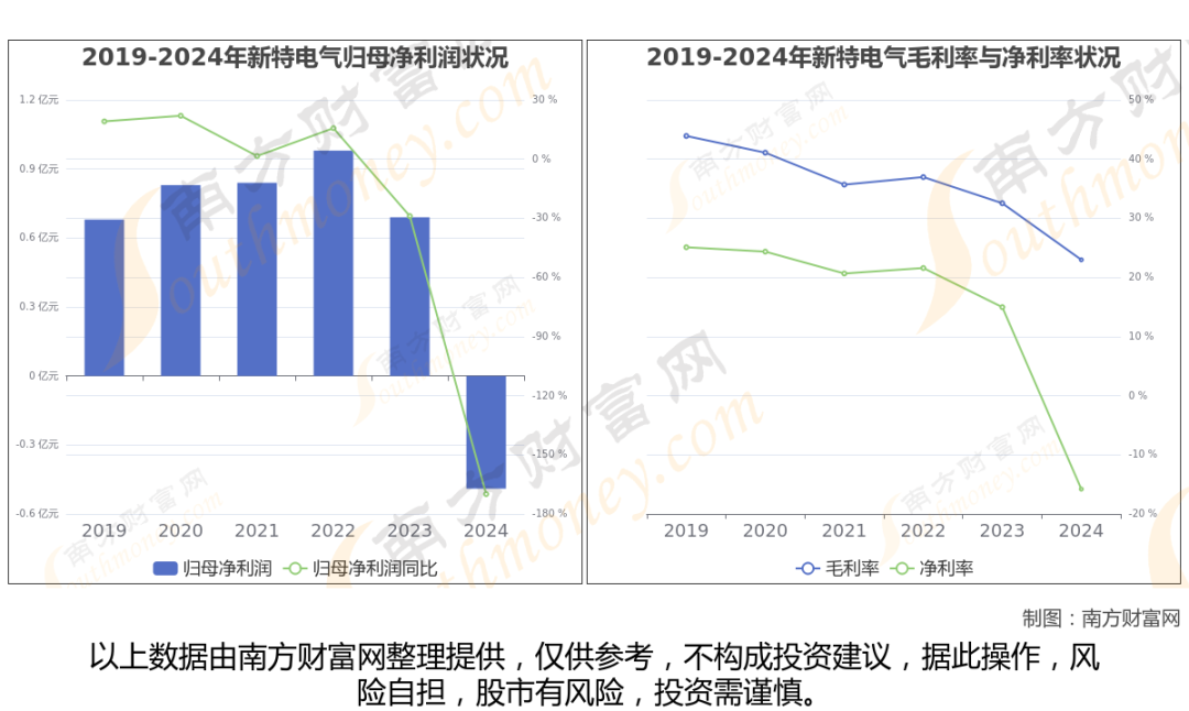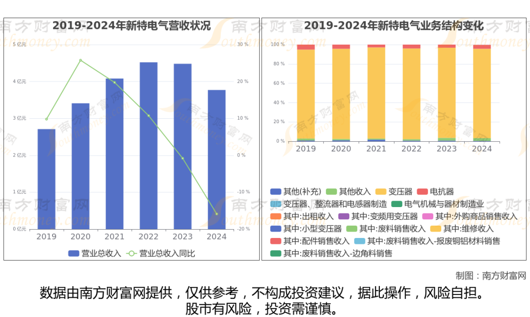 数据显示(如上图),新特电气2024年营业收入为3.77亿,同比增长-15.88%,近5年复合年增长率2.57%。
