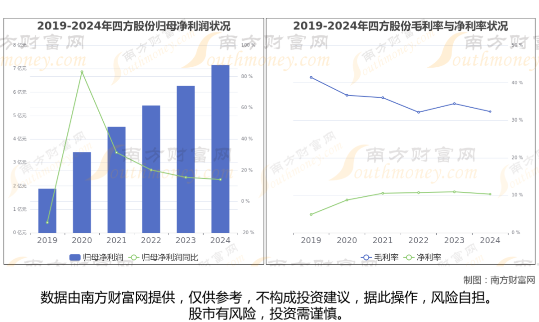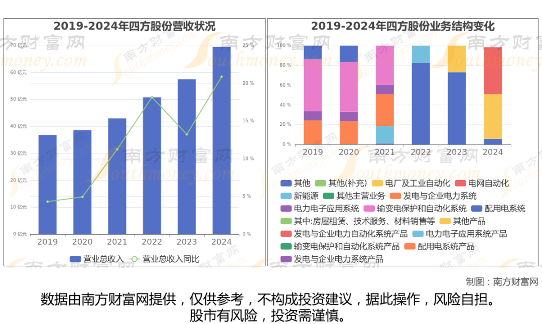 数据显示(如上图),四方股份2024年营业收入为69.51亿,同比增长20.86%,近5年复合年增长率15.82%。